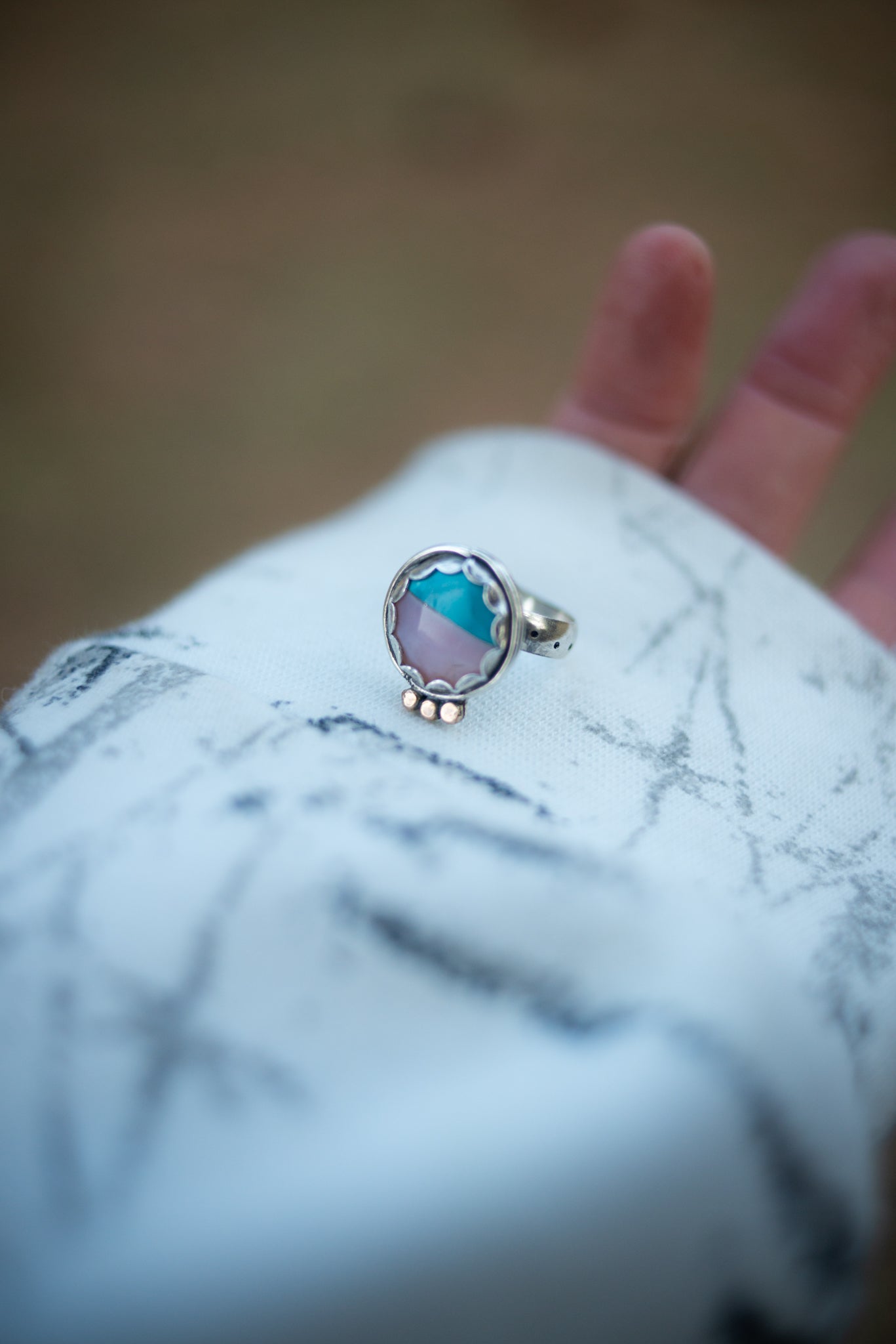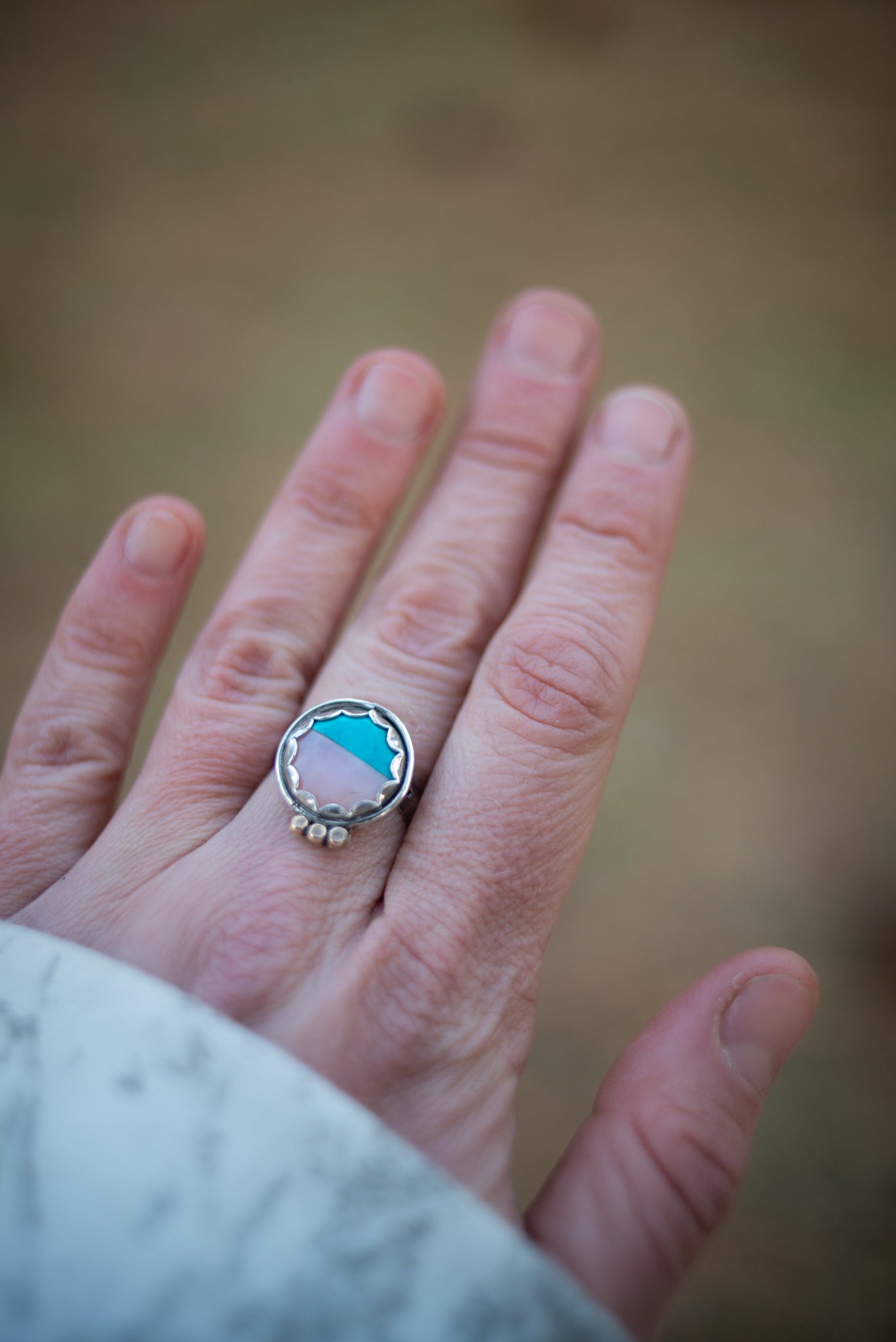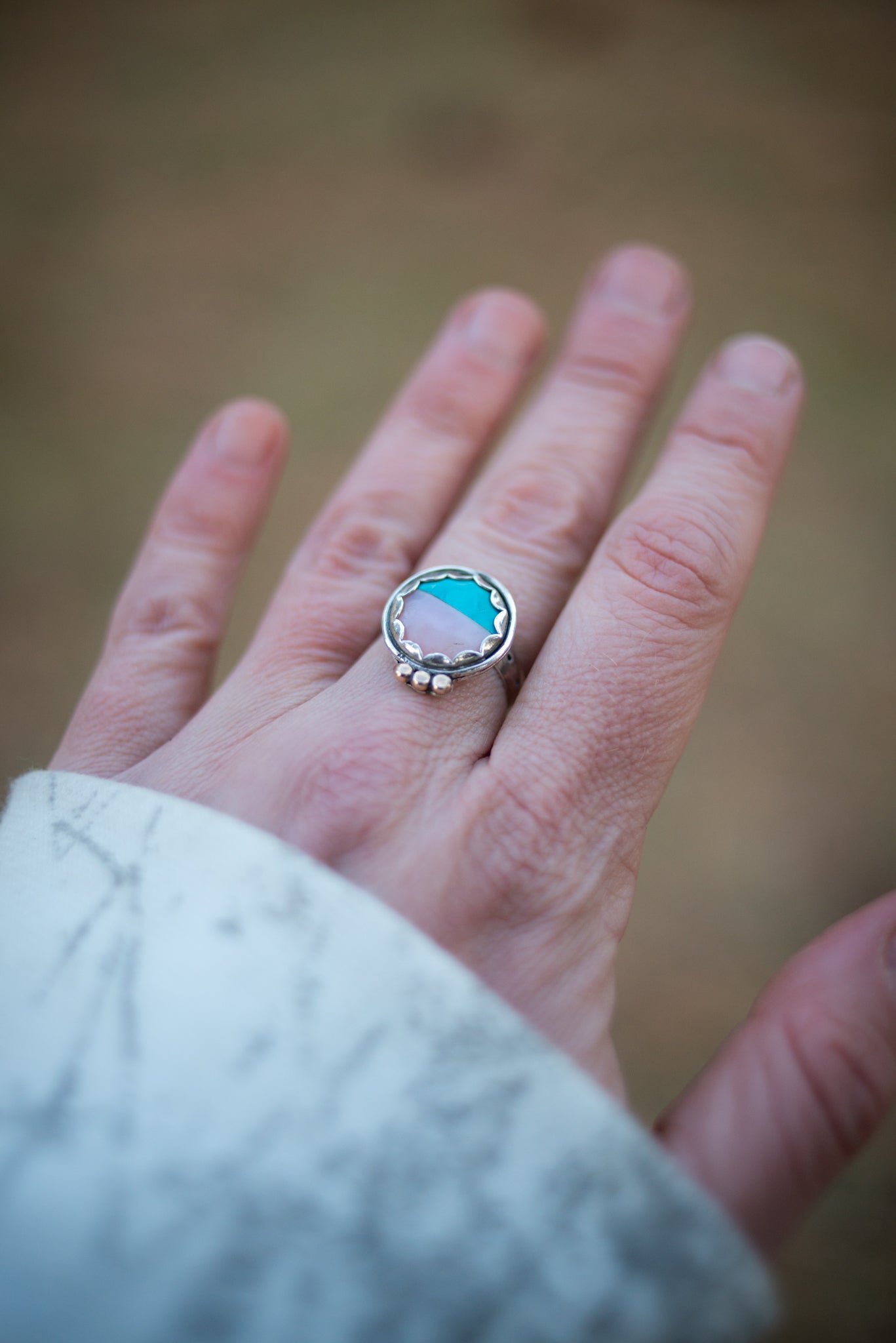 Pink Peruvian Opal & Turquoise, Size 7 3/4 Can be made up to an 8.5. Just mention it in the comments section at check out.